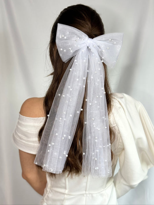Bridal Hair Bow White Tulle Pearl Handmade