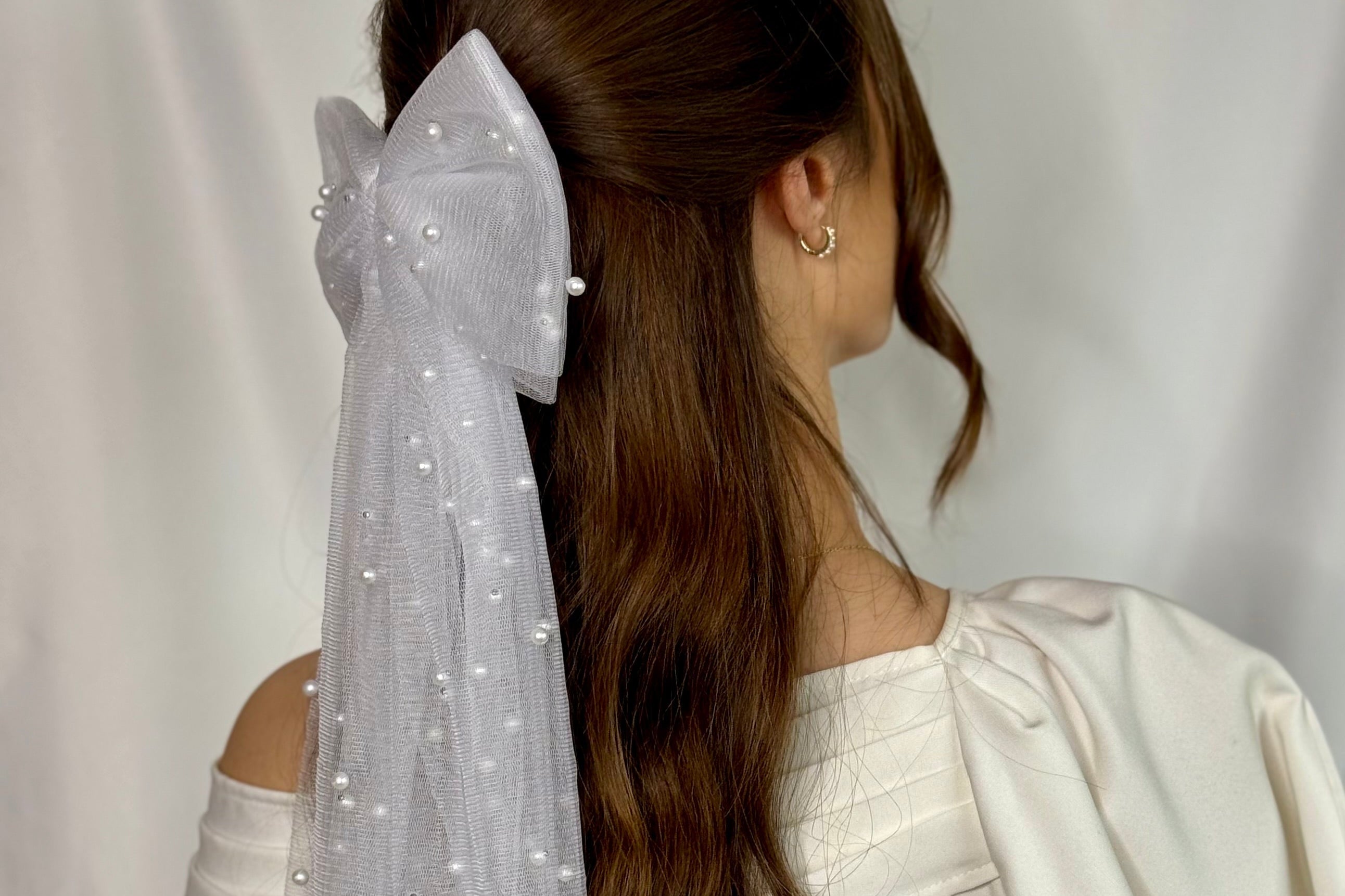 Bridal Hair Bow White Tulle Pearl Handmade